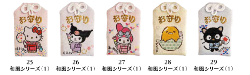 伝統的な和柄(着物風、桜や波紋などの文様、金箔加工など)を基調としたサンリオキャラクターのお守りがかわいいですよね。ご利益は健康、学業、縁結びなどキャラクターごとに異なることが予想されます。